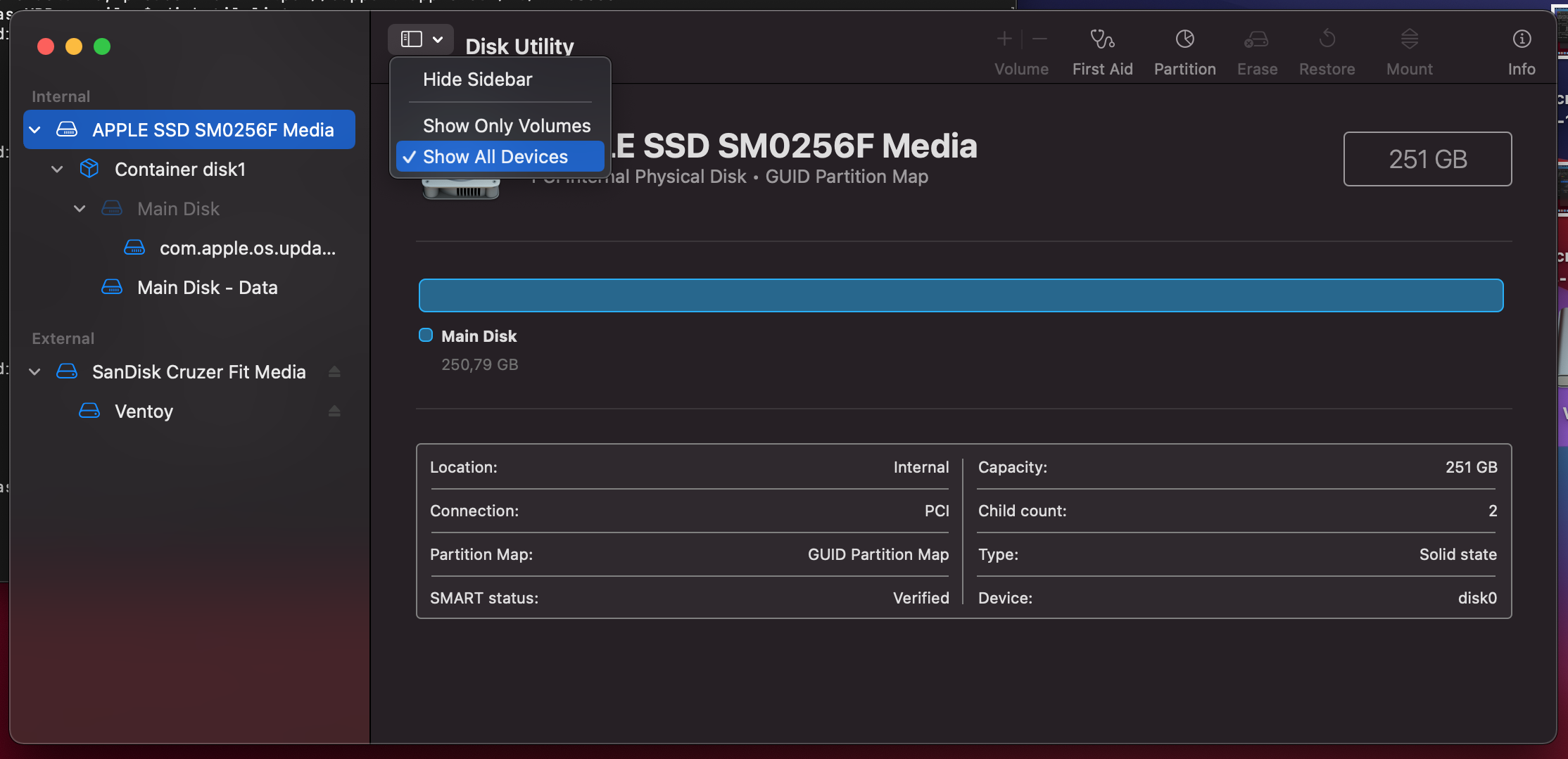 - For the actual resize, open the Disk Utility app and in dropdown at the top select