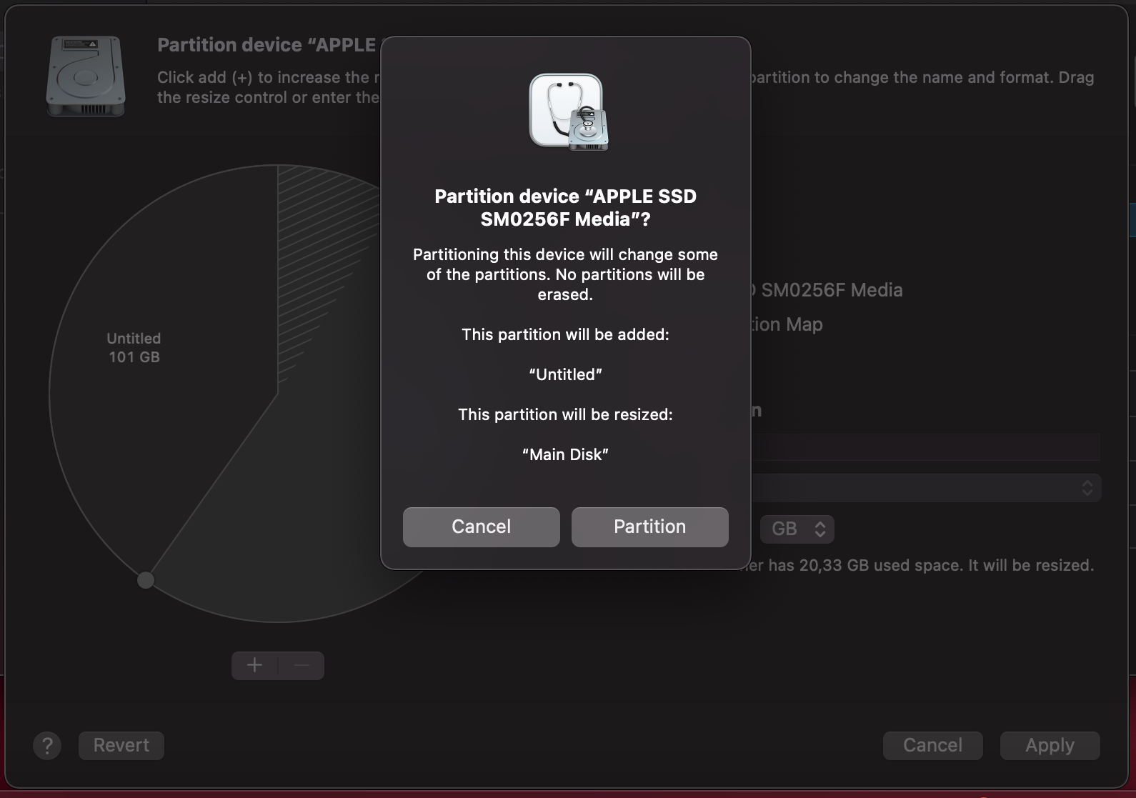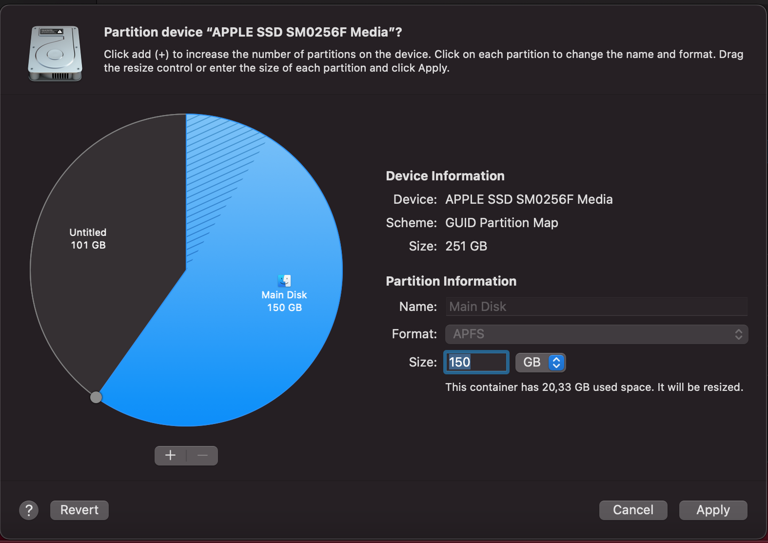 APPLE SSD SM…in the image above). press thePartitionbutton on the top right and resize the main partition to the new desired size (150GB in my case):