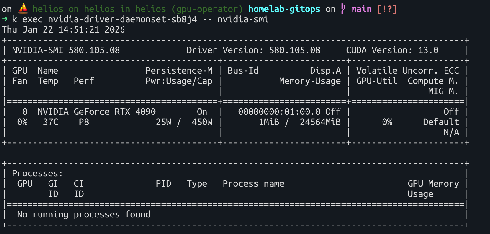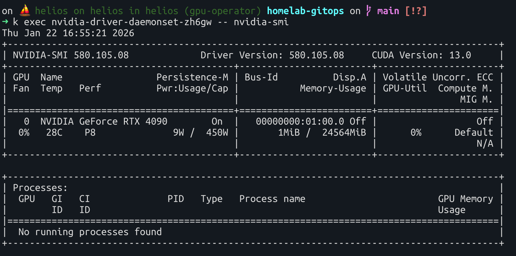 My homelab GPU machine, Helios, runs an RTX 4090 with a fairly complex stack: Proxmox → Ubuntu VM (GPU Passthrough) → Kubernetes → NVIDIA GPU Operator (I may write about this setup in the future…).
